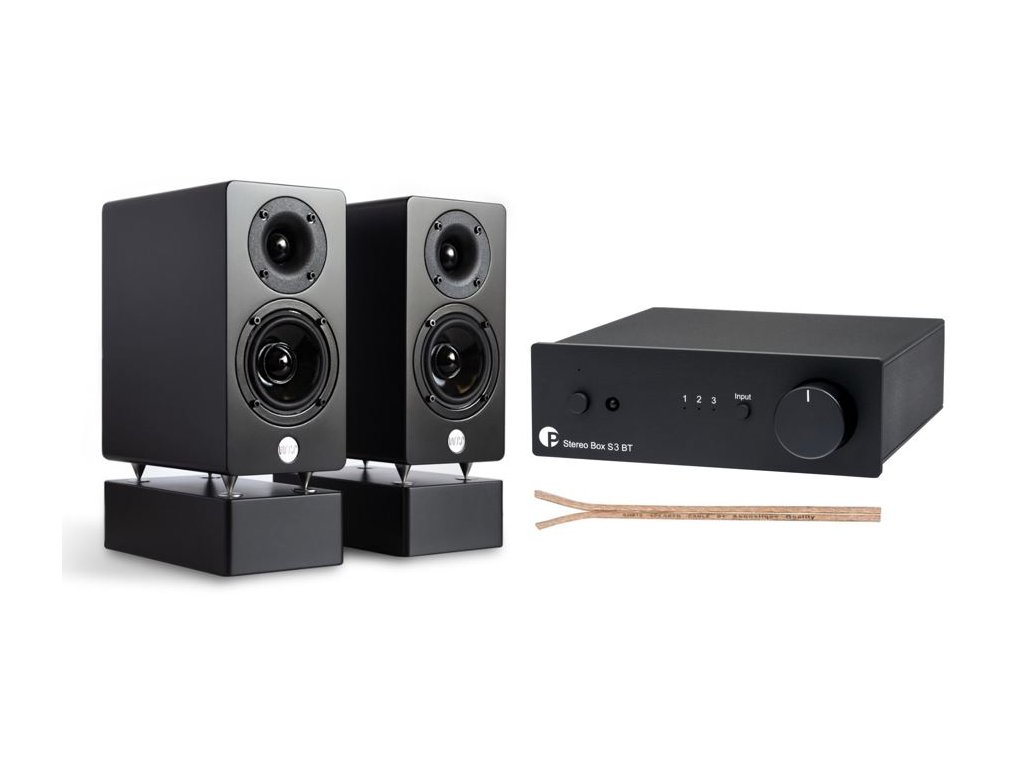 Cenově zvýhodněný set zesilovače Pro-Ject Stereo Box S3 BT black a páru reproduktorů WRS MM2 black passive včetně 4 m reprokabelu 1,5 mm2