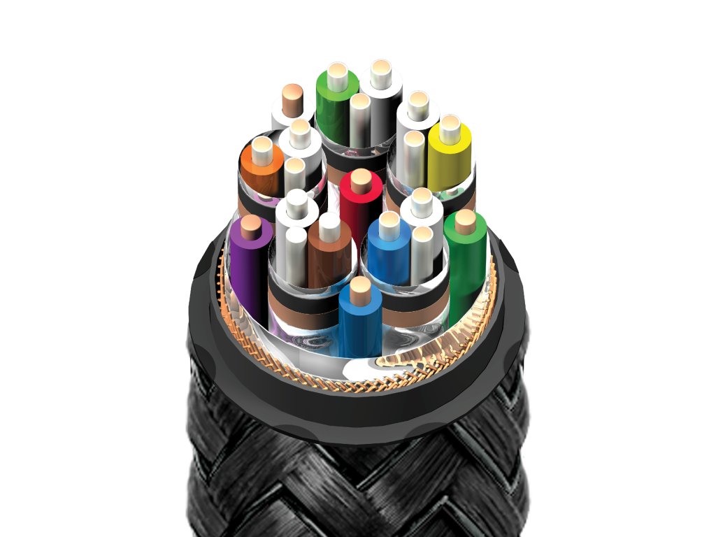 - Účinný systém pro rozptýlení šumu a vysokofrekvenčního rušení - ÚROVEŇ 6 - Dvě kovové vrstvy s mezivrstvami z uhlíku a grafenu kolem 4 párů FRL + eARC vodičů. Navíc přidáno celoobvodové opláštění z uhlíku a patentovaný systém polarizace dielektrika DBS pro maximalizaci účinnosti rozptylu šumu