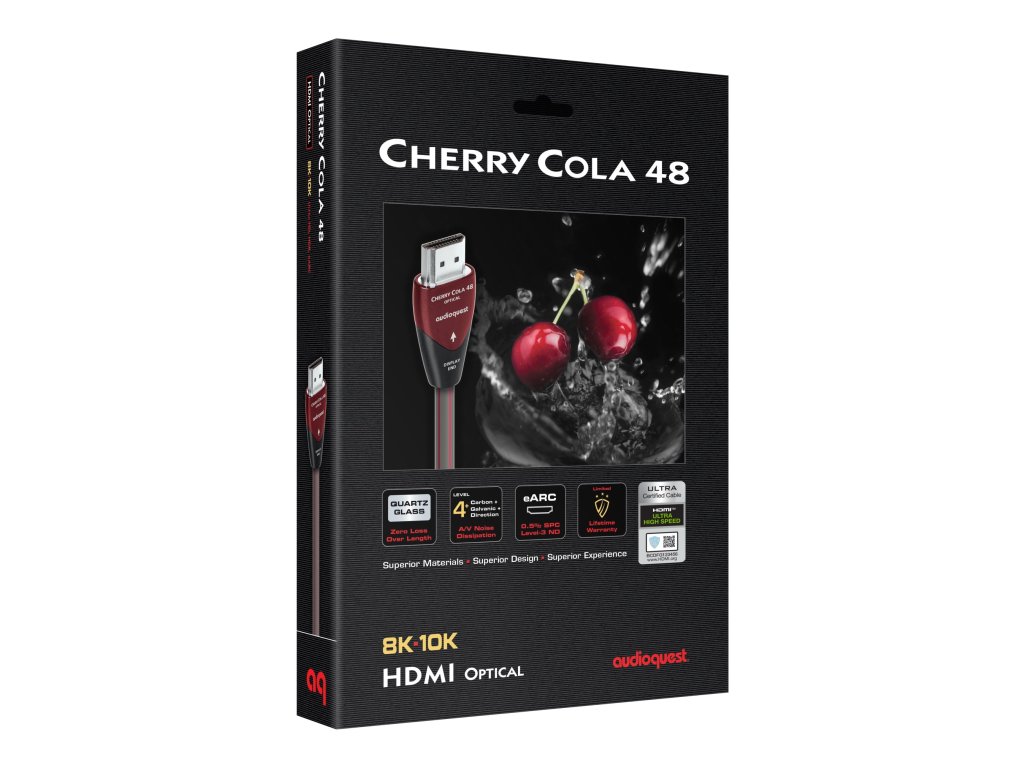 AV vodiče pro s optickými vlákny eliminují různé formy degradace i na dlouhé vzdálenosti. Napájení zajišťuje přímo port HDMI a není potřeba žádný AC adaptér. Tyto optické vodiče jsou naprosto imunní vůči vysokofrekvenčnímu rušení. Sofistikovaný systém stínění NDS (Noise-Dissipation System) společnosti AudioQuest kombinuje vysokofrekvenční uhlík pohlcující šum a směrově řízené postříbřené vodiče (eRAC vodiče a zemnící vodiče). Právě vrstva postříbření má zásadní vliv na vynikající zvukové kvality kabelu. Díky tomu je minimalizován šum a  zkreslení způsobené vysokofrekvenčním rušením. Kabel Cherry Cola 48 disponuje pláštěm s přetlakovou izolací a vyhovuje tak požadavkům CMG (CL3 / FT4) na nízkou hořlavost .