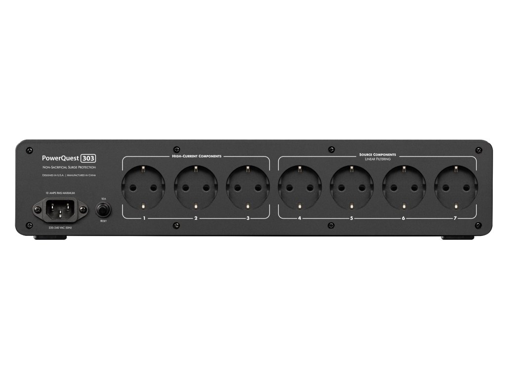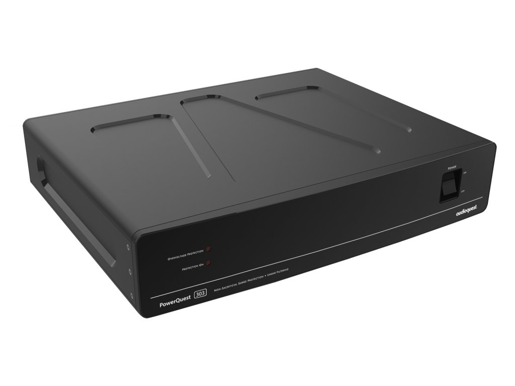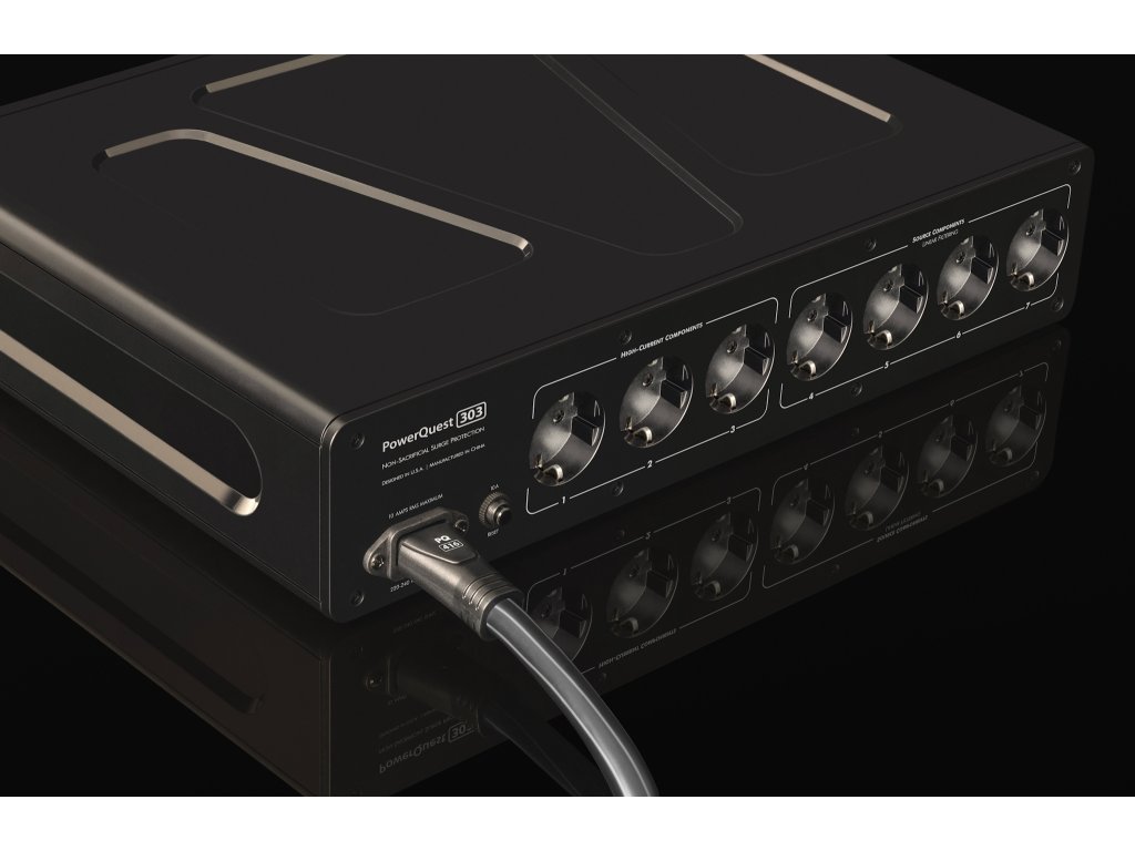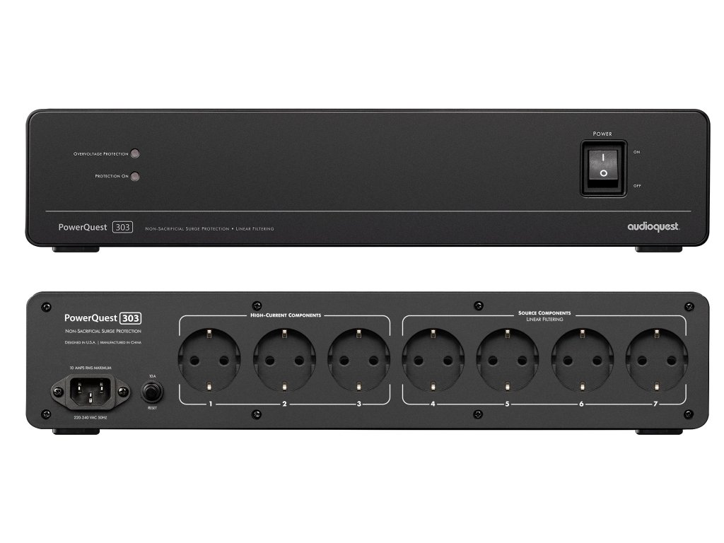 AudioQuest PowerQuest 303 EU je výkonný kondicionér napájení se 7 AC zásuvkami (3 High-Current pro zařízení s vysokým odběrem proudu a 4 pro zdrojové komponenty). Vysoká účinnost filtrace je zajištěna díky lineárnímu rozptylu asymetrického šumu v diferenciálním režimu s šířkou pásma (30 kHz – 1 GHz, více než 22 dB) - tento šum je běžně přítomný v rozvodné síti nebo vzniká v připojeném zařízení.