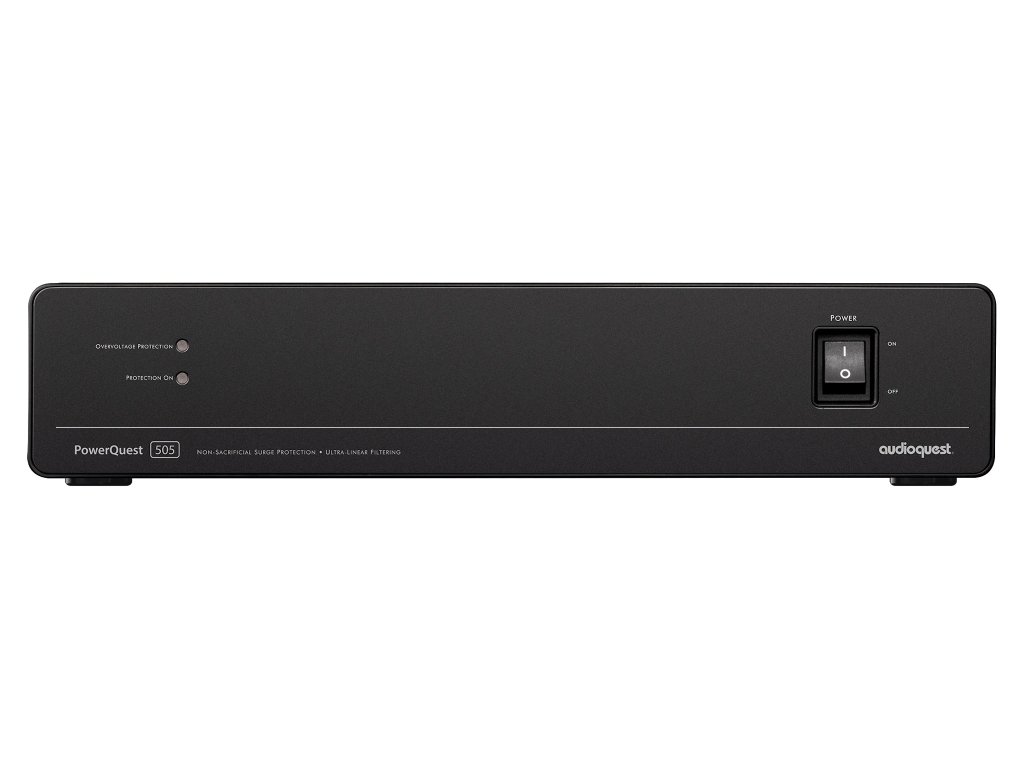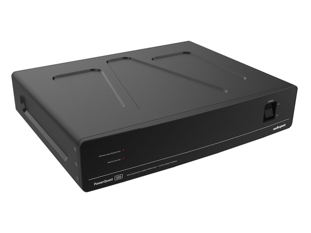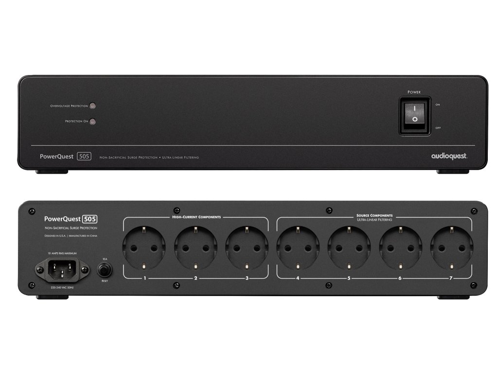 AudioQuest PowerQuest 505 EU je vysoce výkonný kondicionér napájení se 7 AC zásuvkami (3 High-Current pro zařízení s vysokým odběrem proudu a 4 pro zdrojové komponenty). Vynikající účinnost filtrace je zajištěna díky ultralineárnímu rozptylu asymetrického šumu v diferenciálním režimu s šířkou pásma (30 kHz – 1 GHz, více než 22 dB) - tento šum je běžně přítomný v rozvodné síti nebo vzniká v připojeném zařízení. Navíc probíhá i filtrace symetrického šumu ve společném režimu v pásmu (30 kHz – 100 MHz) - tento šum je vyzařován do země a na „nulový“ kontakt napájecích kabelů.