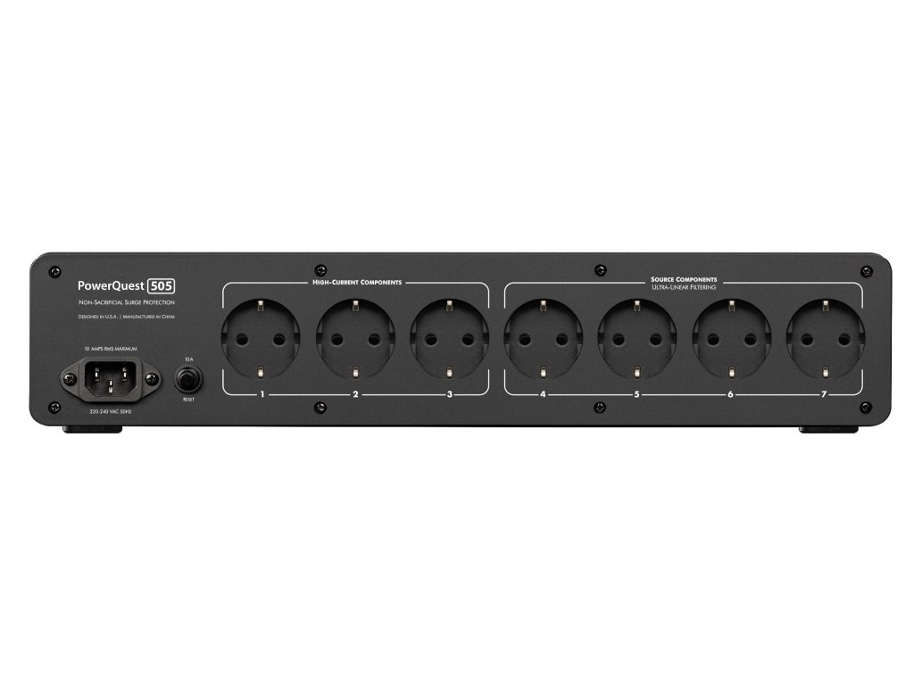 K PowerQuest 505 EU můžete bez obav zapojit celý domácí audio systém, protože nabízí 3 High-Current zásuvky pro komponenty s proměnným proudem (výkonové zesilovače, aktivní reproduktory, A/V přijímače, subwoofery atd.) a 4 zásuvky s lineárním filtrem pro zdrojové komponenty s konstantním proudem (televizory, zařízení pro streamování médií, přehrávače disků, gramofony, předzesilovače, atd.). Tyto 4 zásuvky jsou plně izolovány od 3 High-Current AC zásuvek, čímž je zajištěno lepší přizpůsobení filtru připojenému zařízení a vyšší schopnost efektivně řídit složité interakce:
