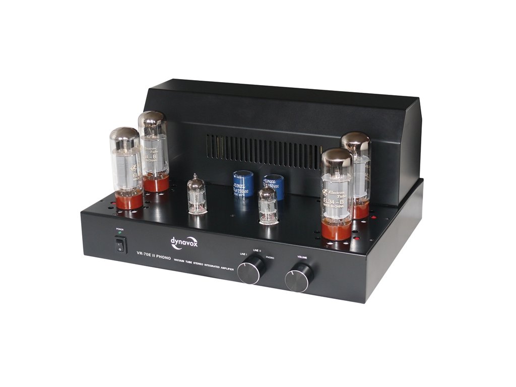 Dynavox VR-70E II Phono je novinkou 2019 a updradem VR70E II. Upgrade s označem "Phono" zahrnuje 2 další vstupy, z nichž jeden je čistý Phono vstup pro gramofonový přístroj (přepínatelný MM / MC). Jinak úspěšné zařízení zůstane ve svých technických údajích nezměněno: 3 vstupy a připojení reproduktorů pro 4 a 8 ohmů, 2 x 40 W RMS ve frekvenčním rozsahu 10 Hz - 40 kHz. Osazený je elektronkami: 4 x EL34 (Ultralinear obvod) pro finální fázi, 2 x 6F2 (ECF82) pro předstupeň a fázovou inverzi. Lze také použít jako výkonový zesilovač spolu s elektronkovým předzesilovačem TPR-1 (BN204244 nebo BN204242). Dodává se s odnímatelnou ochrannou mřížkou.