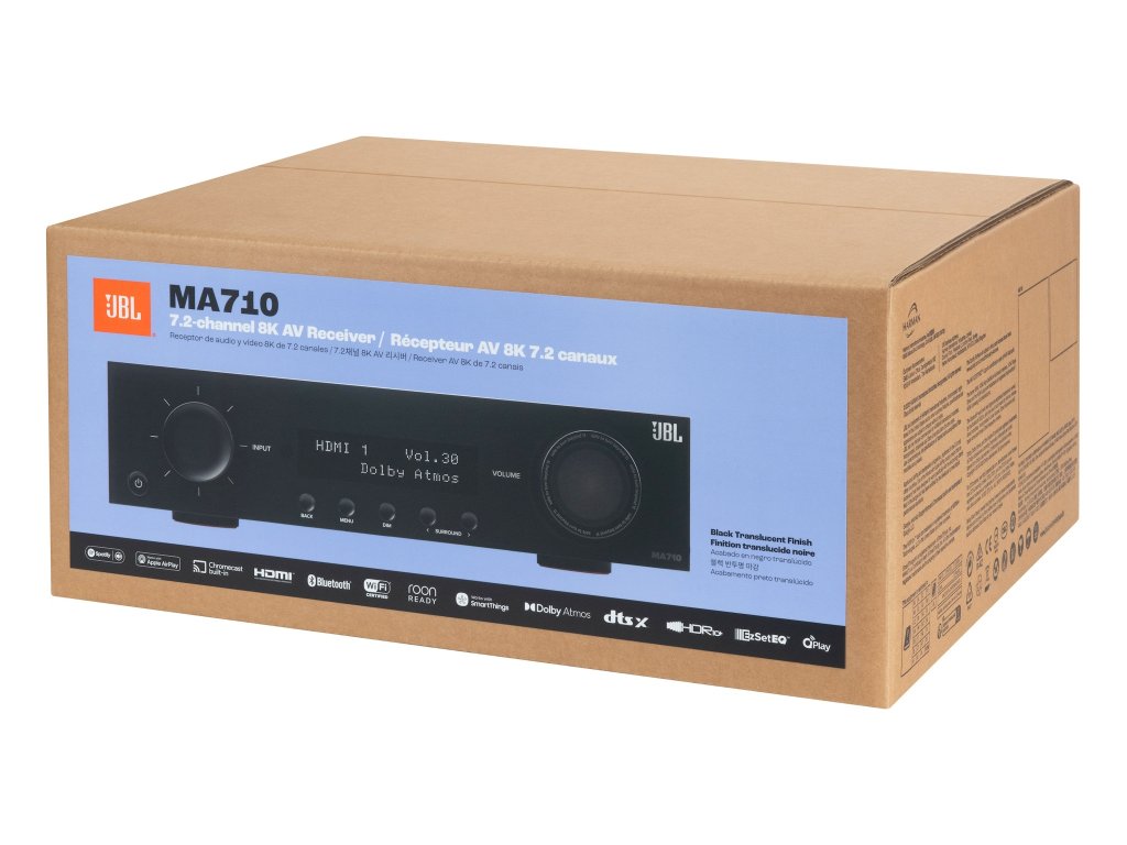 JBL MA710 je první model z řady AV zesilovačů JBL, který nabízí zesílení pro 7 kanálů a je kompatibilní s technologií prostorového zvuku Dolby ATMOS a DTS-X. Podporuje 8K video včetně formátů s vysokým dynamickým rozsahem kontrastu Dolby Vision a HDR 10+. Majitelé nejvýkonnějších herních zařízení je mohou připojit přímo k některému ze vstupů HDMI verze 2.1 s přenosovou rychlostí až 40 Gbps. Kromě 8K @ 60 Hz videa ocení při hraní nejnáročnějších her i kompatibilitu 4K s obnovovací frekvencí 120 Hz, která zajistí plynulý pohyb UHD obrazu při gamingu, ultrarychlém pohybu, sportu nebo v akčních filmech. Herní ambice podtrhuje i podpora technologií ALLM, QFT a VRR (Variable refresh rate), protože ostrý obraz je nutný pro vysoce výkonné hry, které z variabilní obnovovací frekvence 120 Hz významně těží.