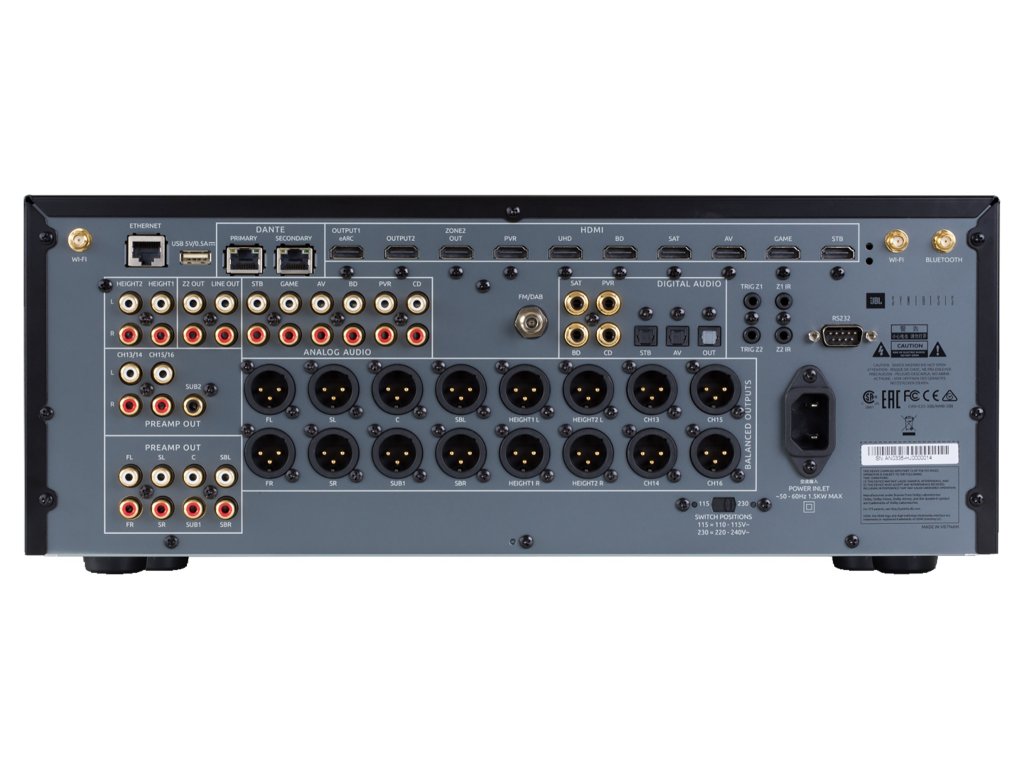 • PRE AMP výstup z předzesilovače 15 kanálů + 2 x subwoofer (konektory RCA) nebo symetrické výstupy s konektory XLR pro 15 kanálů + 1 subwoofer