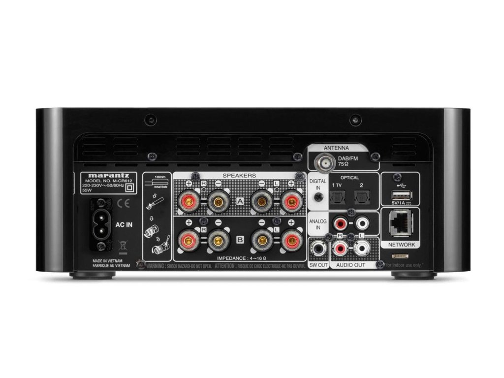 Stereo systému Marantz s CD přehrávačem, DAB tunerem, internetovým připojením pro Tidal, Spotify, rádia atd. Po automatické instalaci nového firmware Marantz M-CR612 podporuje Tidal Connect a Hi-Res Audio. Mimo klasických korekcí Basy, výšky má i DBB Bass na zvýšení dynamiky při tichém poslechu. Můžete přístrojem napájet až dva páry reprosoustav s tím, že se dá regulovat hlasitost každého páru reprosoustav zvlášť.