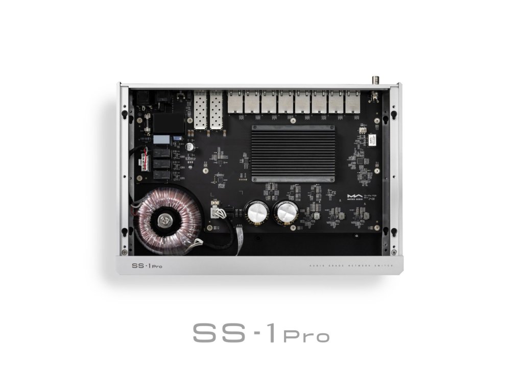 SS-1 Pro je osazen na míru vyrobeným toroidním transformátorem s filtračními kondenzátory o kapacitě 10 000 μF a až šesti ultra-nízkošumovými lineárními napájecími zdroji LDO, které poskytují čisté, stabilní a nehlučné napájení. Pro možnost upgradu SS-1 Pro na vyšší výkon je switch vybaven vstupem pro externí hodiny, což výrazně zvyšuje jeho výkon. V režimu externích hodin pracuje na frekvenci 10 MHz jako reference pro RF syntezátor. DPLL poté vysílá synchronizovaný, vysoce stabilní signál s nízkým fázovým šumem do hlavního ovladače, čímž zajišťuje výjimečný výkon.