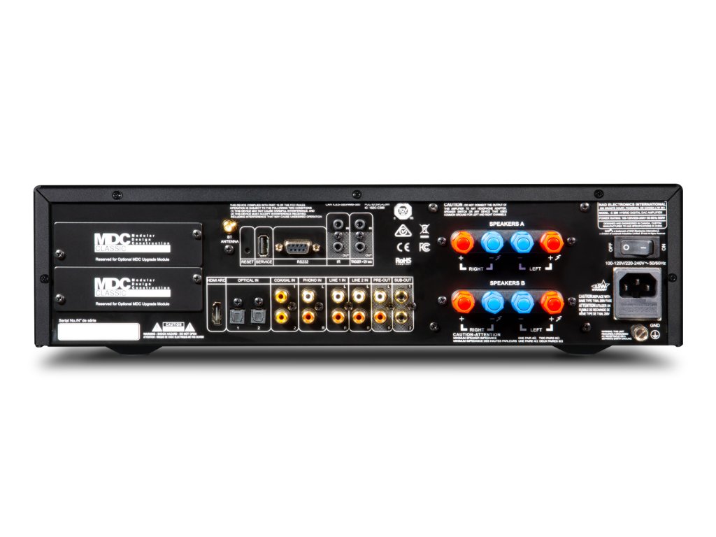| Vstupy: | 2 x stereo linkový RCA, 1 x Phono MM stereo vstup pro gramofon, 2 x digitální optický TOSLINK, 2 x digitální koaxiální, 1 x HDMI eARC, 1 x IR 3.5 mm jack, 1 x 12 V trigger 3.5 mm jack, 1 x sériový RS-232, 1 x USB-A (pouze pro servisní účely) |