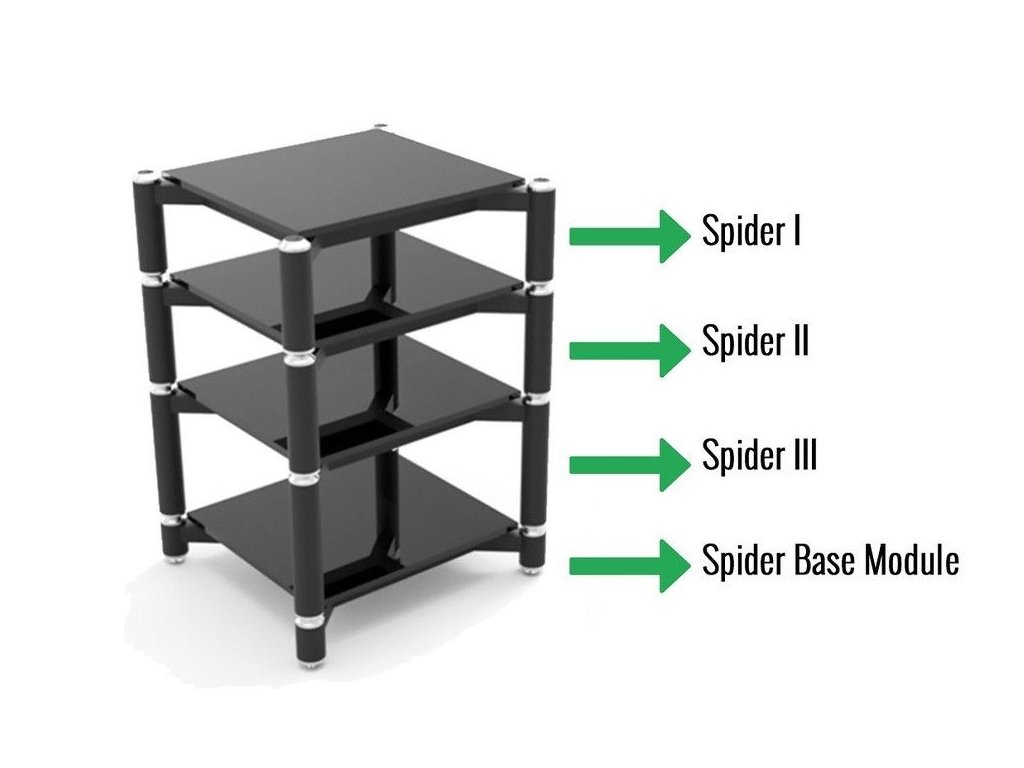 Každý regálový systém v sobě nese úsporu místa, efektivnost, skladnost, některý je však také vizuálně zajímavým prvkem v interiéru. Pevný černý kovový podstavec hostí skleněné nebo bambusové plošiny o tloušťce 15 mm, na které se může pohodlně zabydlet některý z domácích komponent. Stabilní i vizuálně zábavný prvek disponuje mimo jiné dutými nohami, které mohou být naplněny olovnatými zrnky pro větší stabilitu. Výplň zároveň zlepšuje audiofilní vlastnosti. Spider není hřištěm pro pavouky, ale charakteristickým ukládacím místem pro domácí hi-fi i jiné audio video komponenty. Vlastnosti horní plošiny může umocnit deska Norstone Anti Vibration Glass.