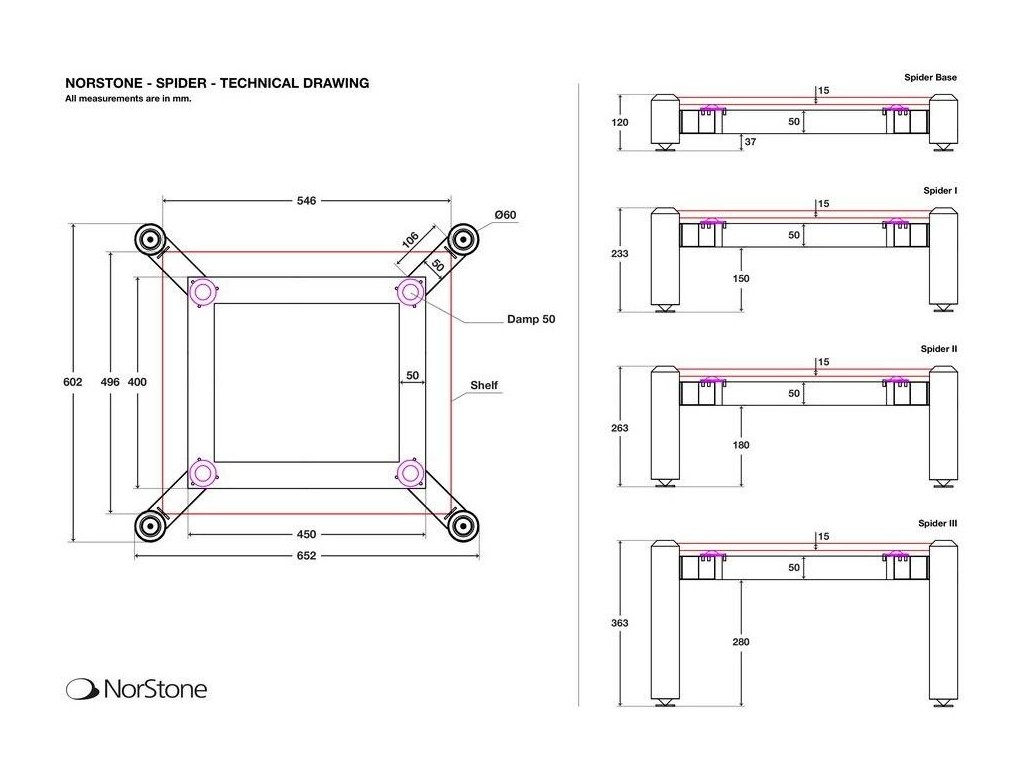 V balení jsou k dispozici celkem čtyři komponenty – základna s výškou 120 mm, dále 233 mm, 263 mm a nejvyšší 363 mm, kde se může vyhřívat například koncový zesilovač. Samozřejmostí je vysoká stabilita pro uložení komponent, včetně špičkové kvality zpracování. Norstone Spider nabízí k využití inovativní moduly I, II, III. Dvě varianty designových návrhů znamenají dlouhé rozhodování při výběru – oba dva typy jsou velmi atraktivní. Vytvořit si tak vlastní zakázkový hi-fi nábytek je výzvou. Konečný model má nosnost max 50 kg a disponuje šířkou 652 mm, hloubkou 602 mm. Výška je variabilní. Ve finále lze při výběru kombinovat kromě rozměrů také barevné zpracování, čímž je zajištěna originalita produktu. Tímto způsobem je možné vytvořit vlastní, osobitý hi-fi modul s vybranými komponenty, jenž poskytne zařízením stabilní, krásnou základnu.