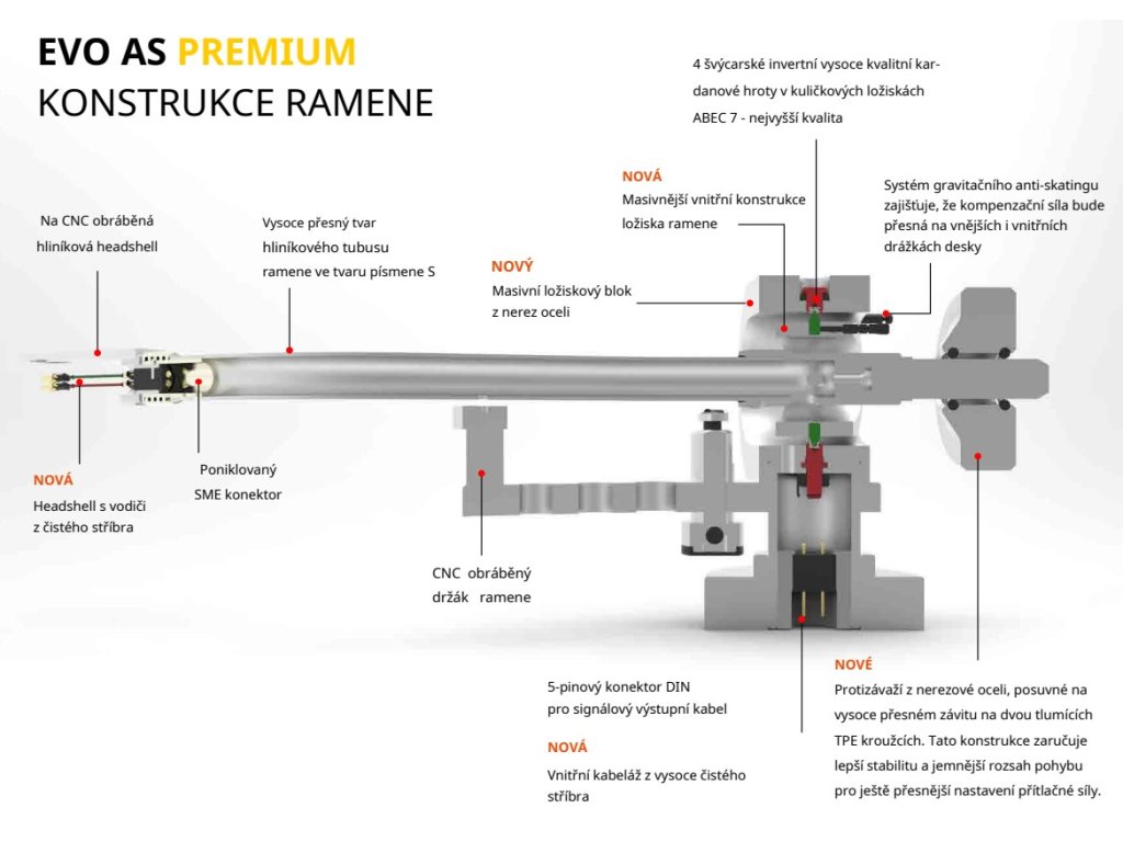Tubus ramene EVO AS PREMIUM HG z ručně leštěného hliníku tvoří speciální hliníková trubice s vnitřním tlumením ve tvaru písmene S se zakončením SME. Signál je veden vodiči z vysoce čistého stříbra. Rameno ve tvaru S je nejen designovým prvkem každého gramofonu, ale představuje také několik technických výhod. Těží především z mnohem menšího zkreslení úhlu drážky a vynikající schopnosti sledování.