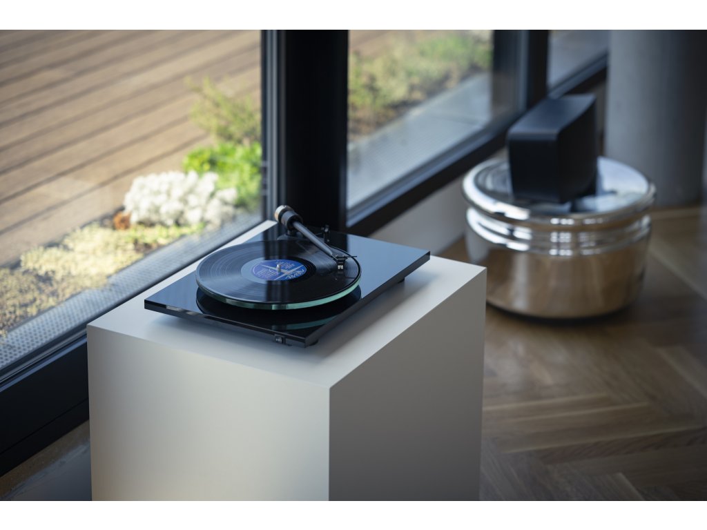 9" rovné hliníkové rameno má efektivní délku 230 mm, ložisko s minimálním třením, viskózně tlumený zvedáček a pružinový anti-skating ovládaný na základně ramene, který pomáhá získat z přenosky maximální potenciál. Rameno je jednodílné se standardizovaným ½" uchycením a dodávanou přenosku je možné kdykoliv v budoucnu vyměnit. Dominantním estetickým prvkem gramofonu je 10 mm silný talíř z čirého skla. Díky své hmotnosti 1,7 kg zaručuje minimální kolísání otáček. Talíř je poháněný krátkým plochým hnacím řemínkem přes subtalíř na ultra přesném (0,001 mm) hlavním ložisku s osou z kalené oceli.