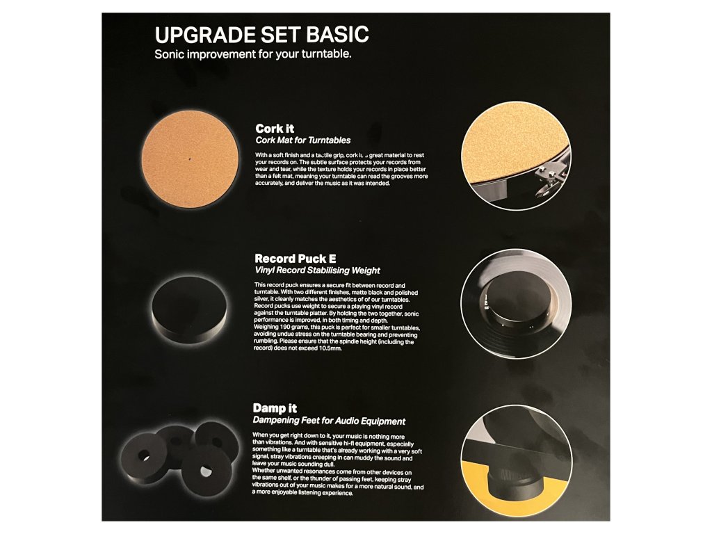 Chcete-li upgradovat zvukové kvality svého gramofonu Pro-Ject, stává se pro vás tato sada příslušenství nepostradatelnou. Obsah sady je univerzální pro všechny modely gramofonů Pro-Ject i většinu gramofonů jiných značek. Použití příslušenství nevyžaduje speciální znalosti ani nastavení, je uživatelsky jednoduché a zvukový přínos je slyšitelný a okamžitý.