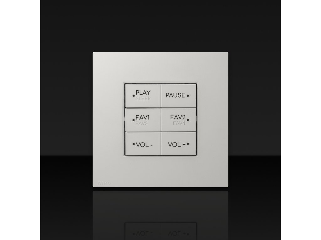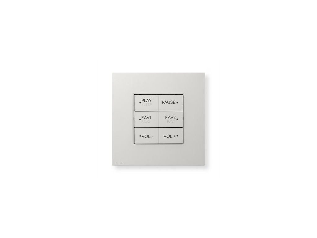 Nástěnný ovladač audio multiroom systému Bluesound. V designovém rámečku značky Niko najdete celkem 6 tlačítek sloužících k pohodlnému ovládání vašeho systému ozvučení Bluesound. Tlačítka slouží na základní povely jako je přehrát a zastavit, ovládání hlasitosti, zapínání a vypínání funkce SLEEP, ale také spuštění oblíbených předvoleb PRESET 1 až 4. nástěnný ovladač systému Bluesound 6 plnohodnotných ovládacích tlačítek zapnutí a pozastavení přehrávání PLAY / PAUSE spuštění oblíbených předvoleb PRESET 1 až 4 zapnutí a vypnutí funkce SLEEP ovládání hlasitosti VOL- / VOL+Doplňkové parametry