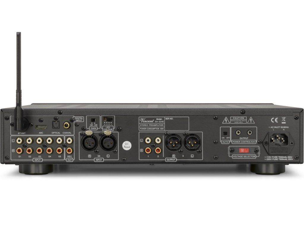 Vstupy: 5 x stereo RCA, 1 x stereo XLR, 1 x optický, 1 x koaxiální, 1 x HDMI (ARC), 1 x Bluetooth